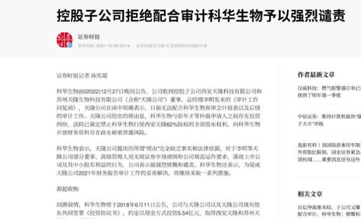 证券时报:控股子公司拒绝配合审计科华生物予以强烈谴责