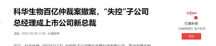 红星新闻:科华生物百亿仲裁案撤案,“失控”子公司总经理成上市公司新总裁